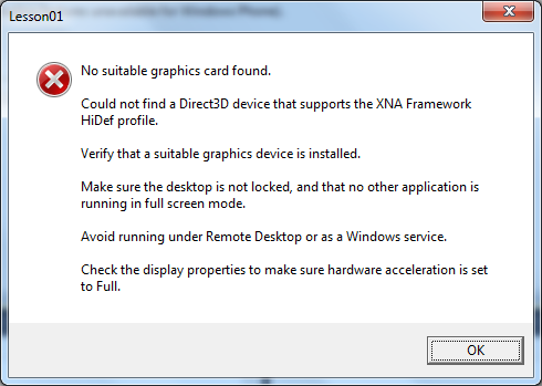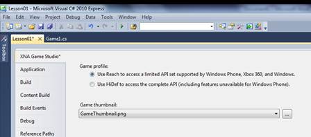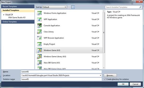 Choose ‘Windows Game 4.0’ and call it Lesson01