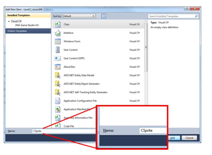 Call it CSprite press 'Add'